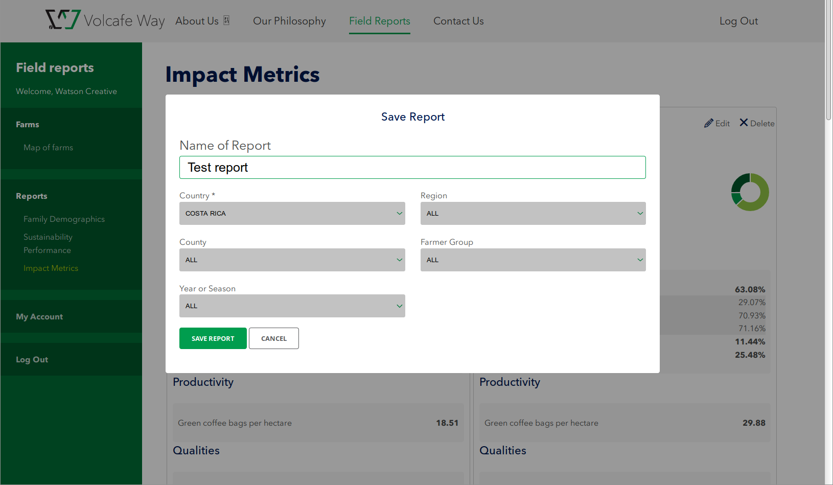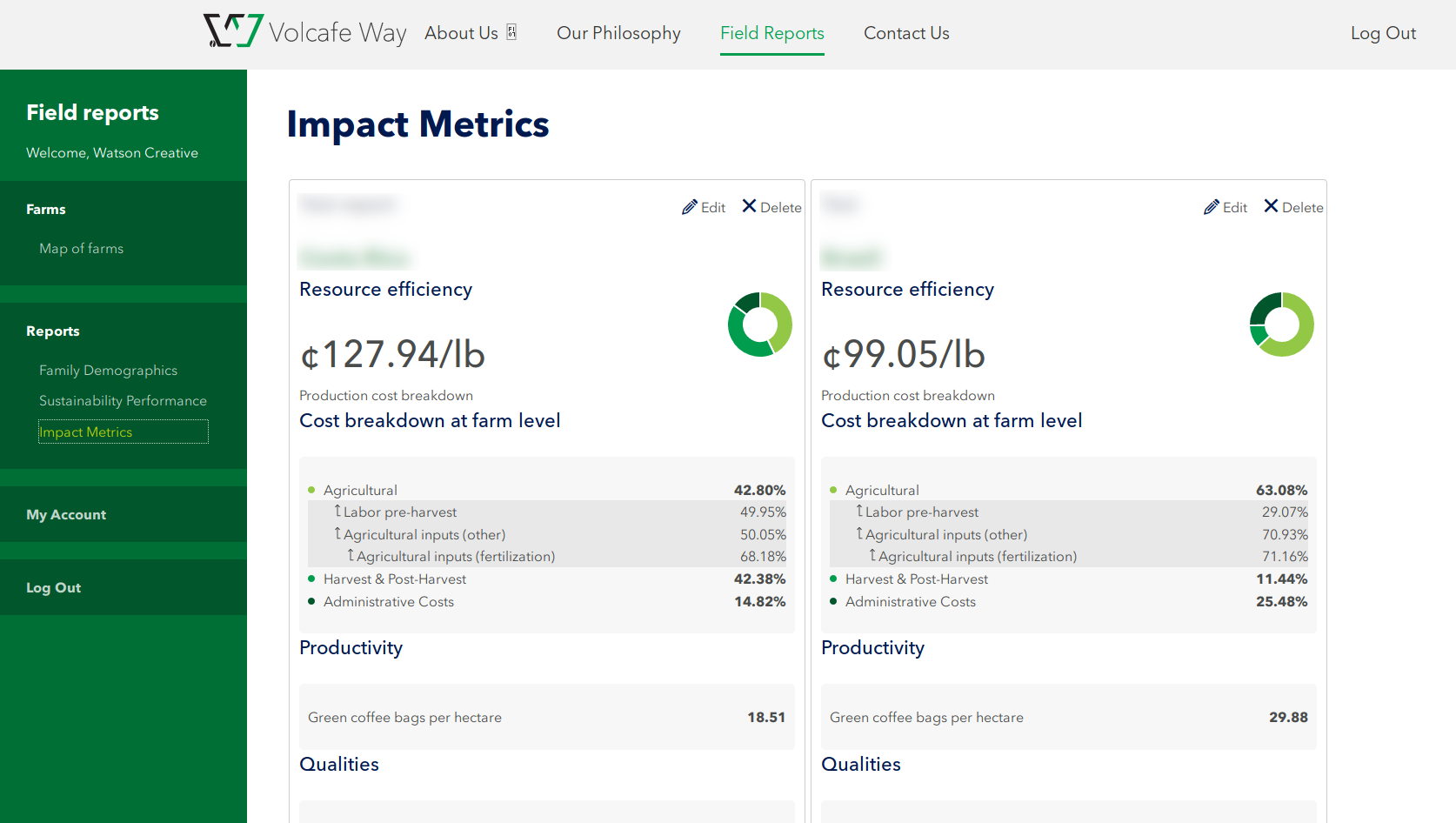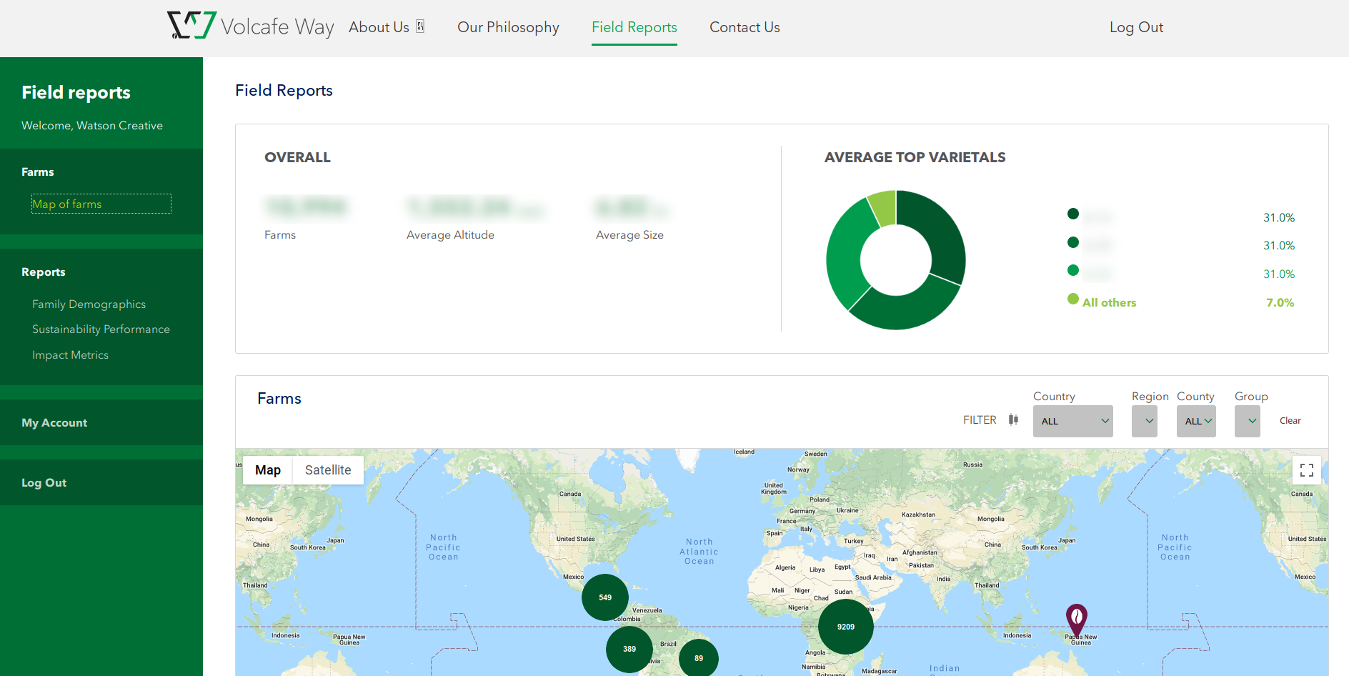 Reporting application for exploring demographic, environmental and financial metrics about coffee growers around the world. Project primary is the Watson Creative agency, providing design and specifications.